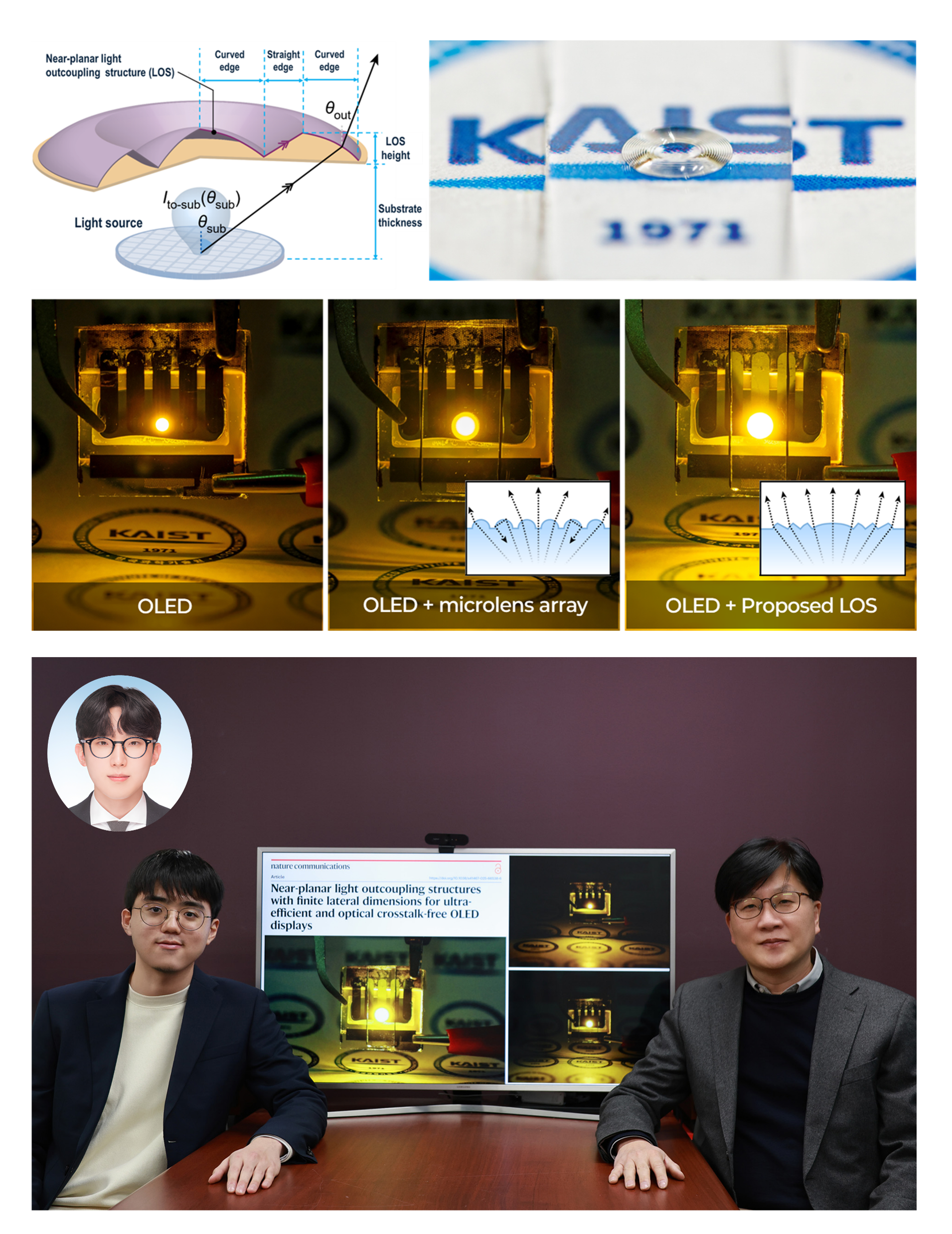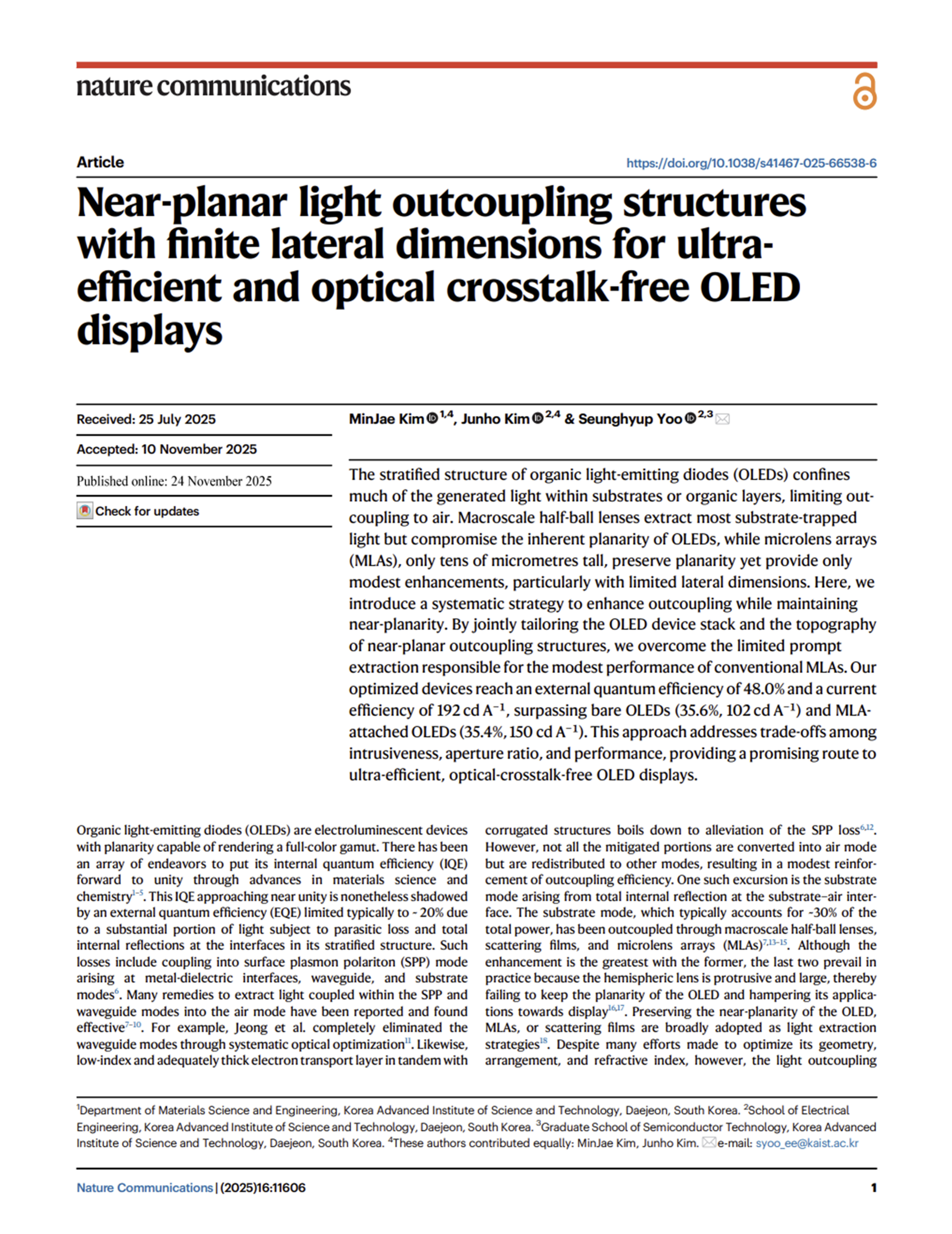 Near-planar light outcoupling structures with finite lateral dimensions for ultra-efficient and optical crosstalk-free OLED displays